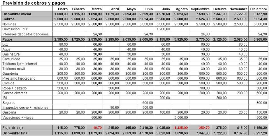 Con una sencilla hoja de cálculo, adaptada a nuestra situación particular, podemos hacer una previsión de cobros y pagos tanto mensuales como anuales. Esto nos permitirá: